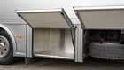 Im Pferdebereich stehen die Pferde schräg zur Fahrtrichtung. Der Pferdebereich ist kameraüberwacht. Die Trennwände sind gepolstert und mit PVC behangen. Die Pferde gelangen über die Heckrampe und/oder Seitenrampe in den Transporter. Das Be- und Entladen wird Ihnen und Ihren Pferden durch die seitlichen Verladegatter erleichtert. Ebenfalls bietet der Rampengummi mit den Trittleisten Ihren Pferden mehr Sicherheit. Über den Kruppen der Pferde befindet sich eine große Ablage für Ihre Decken.
