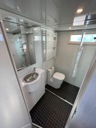 Die Küchenzeile ist mit Kühlschrank, Mikrowelle, Kochstelle und Spüle ausgestattet. Separat ist der Badbereich mit Dusche, Toilette und Waschbecken. Über dem Badebereich befindet sich der Schlafplatz, dieser ist bequem über eine integrierte Treppe zu erreichen.