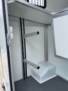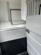 Das Sattelstaufach kann über die Hecktüre durch ein Klappsystem betreten werden. So können Sie die Pferde bei geschlossener Rampe füttern oder auch auftrensen usw. In der Sattelbox befinden sich rechts ein Ablageregal sowie 2 Sattel- und Trensenhalter links.