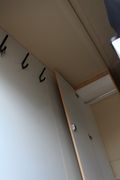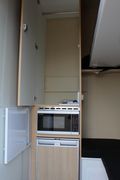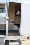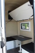 Vorn befindet sich ein kleines Wohnabteil mit Kleiderschrank, Microwelle und Kühlschrank, sowie Sitzplätzen die zum Stockbett umbaubar sind.